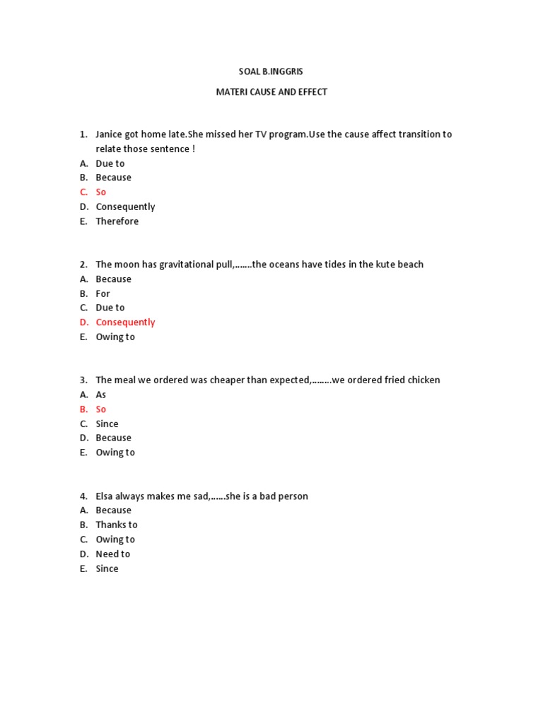 Soal Pilihan Ganda Cause And Effect : Jan 11, 2020 · contoh soal song 7 :. Jan 11, 2020 · contoh soal song 7 : Berikut soal explanation text pg dan essay selengkapnya. Pada postingan ini kita akan melihat sejauh mana pemahaman kita tentang penggunaan, fungsi cause and effect. Mar 09, 2020 · postingan berikut merupakan lanjutan dari materi cause and effect: Jika kemampuan bahasa inggris bagus menjawab soal jenis teks pun akan mudah.